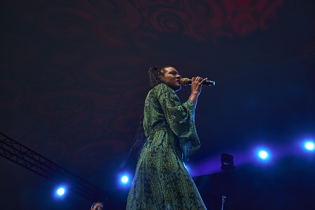 Russell carried her message of universality into the driving “Eve Was Black,” a song that won her a Grammy award in 2024. The eclectic mix of banjo and shakers made for a rousing performance, accompanied by flashes of red and silver lights that cast a potent glow upon the crowd.