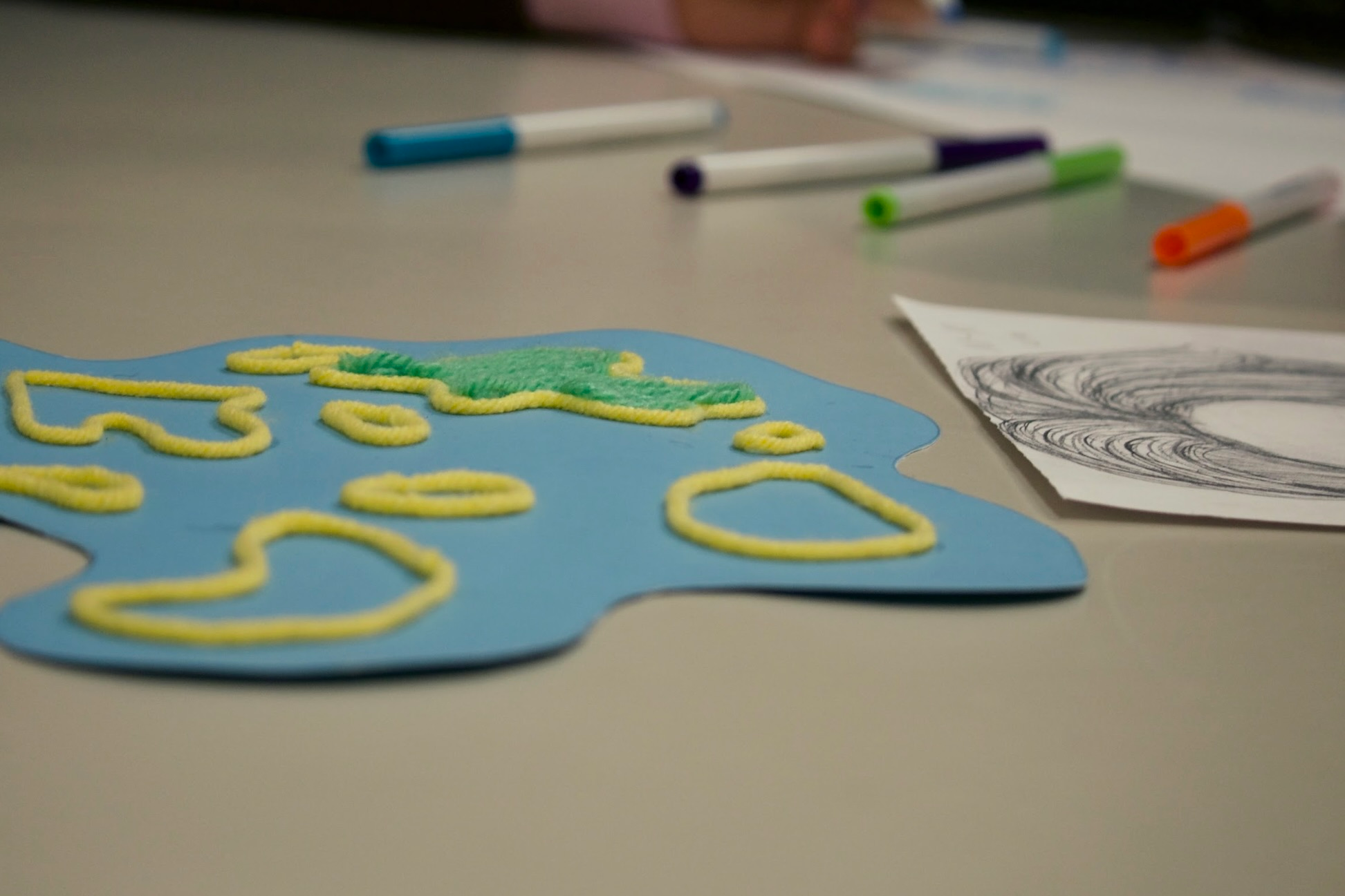 A yarn art piece and markers on a table in the Audio-Visual Resource Centre student lounge. [Photo by Itoro Umanah/the Charlatan]