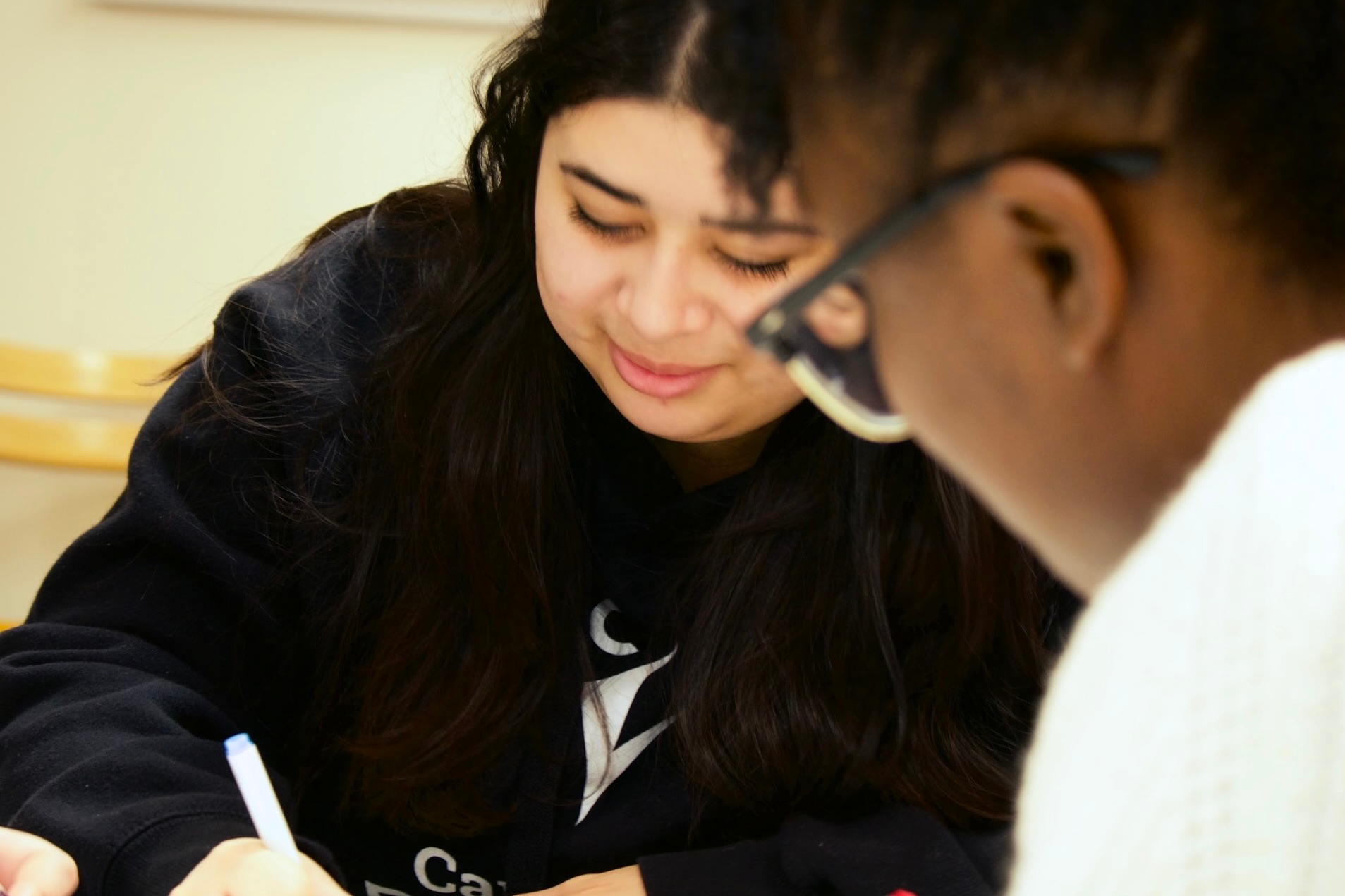 Co-Presidents Ellen Kim and Katrina Diaz exchange laughs during a Valentine’s Day-themed club crafting event. [Photo by Itoro Umanah/the Charlatan]