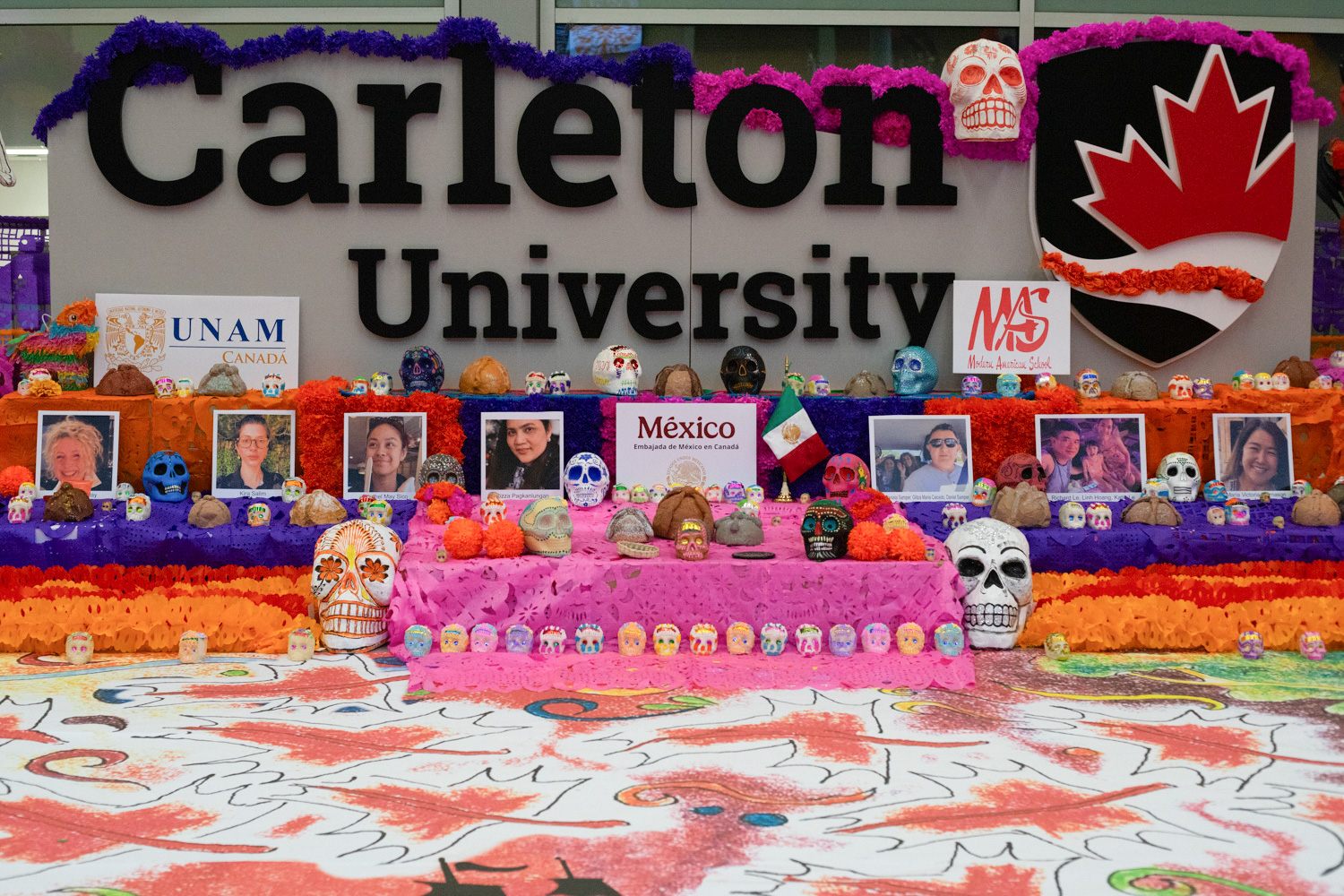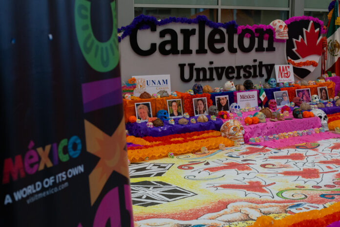 An altar with decorative skulls and colourful floral arrangements accompanied a Carleton University sign for Dia De Los Muertos, or Day of the Dead celebration on Thursday.