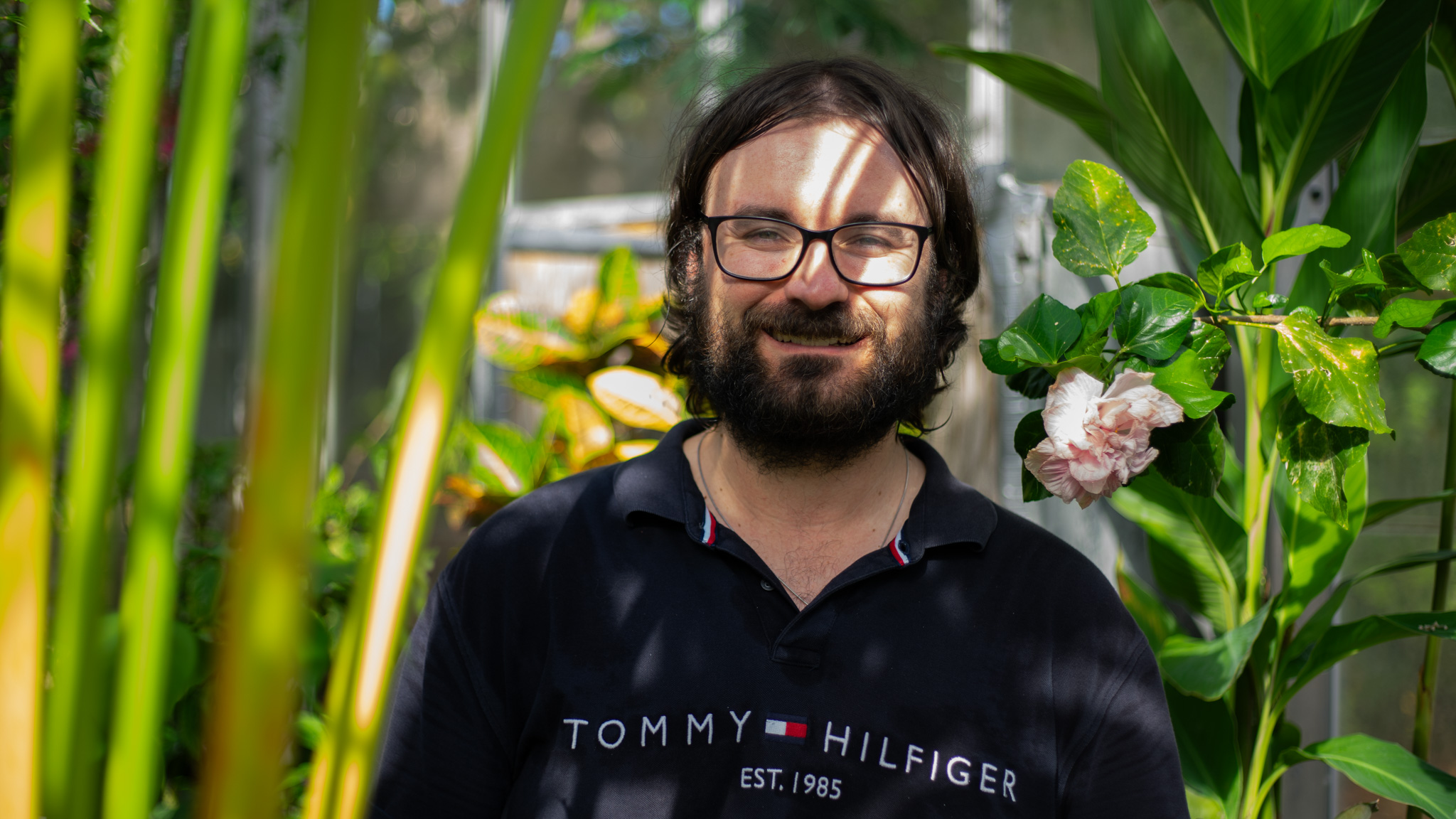 A man in a dark blue Tommy Hilfiger shirt stands and smiles in a greenhouse.