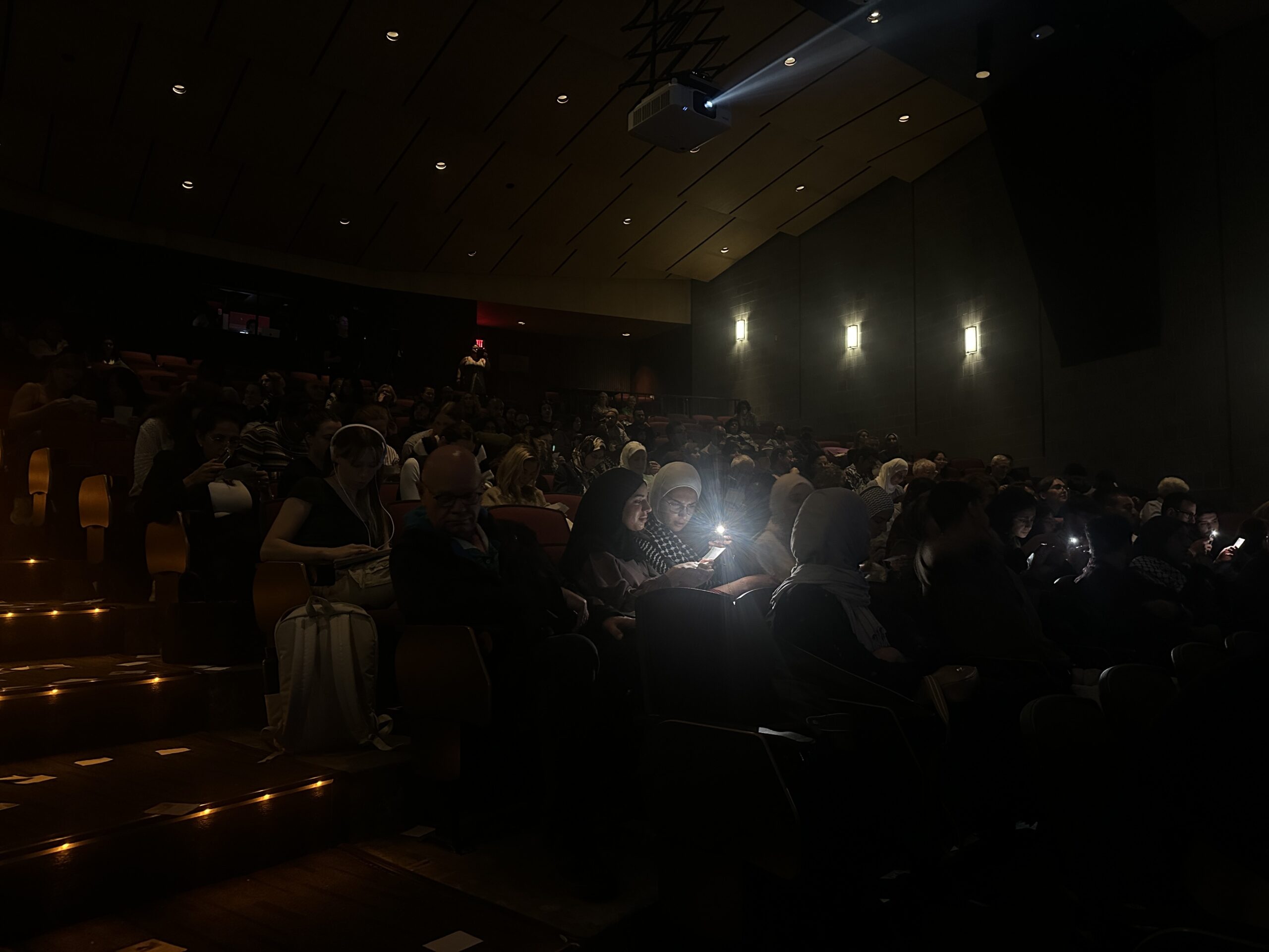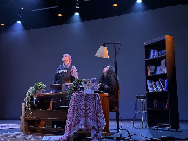 During the show, sounds of drones and bombs echoed around the theatre. Audience members saw clips of how Palestinians in Gaza coped with the constant noise, like teaching classrooms of children to harmonize and sing with the sounds of overhead drones.