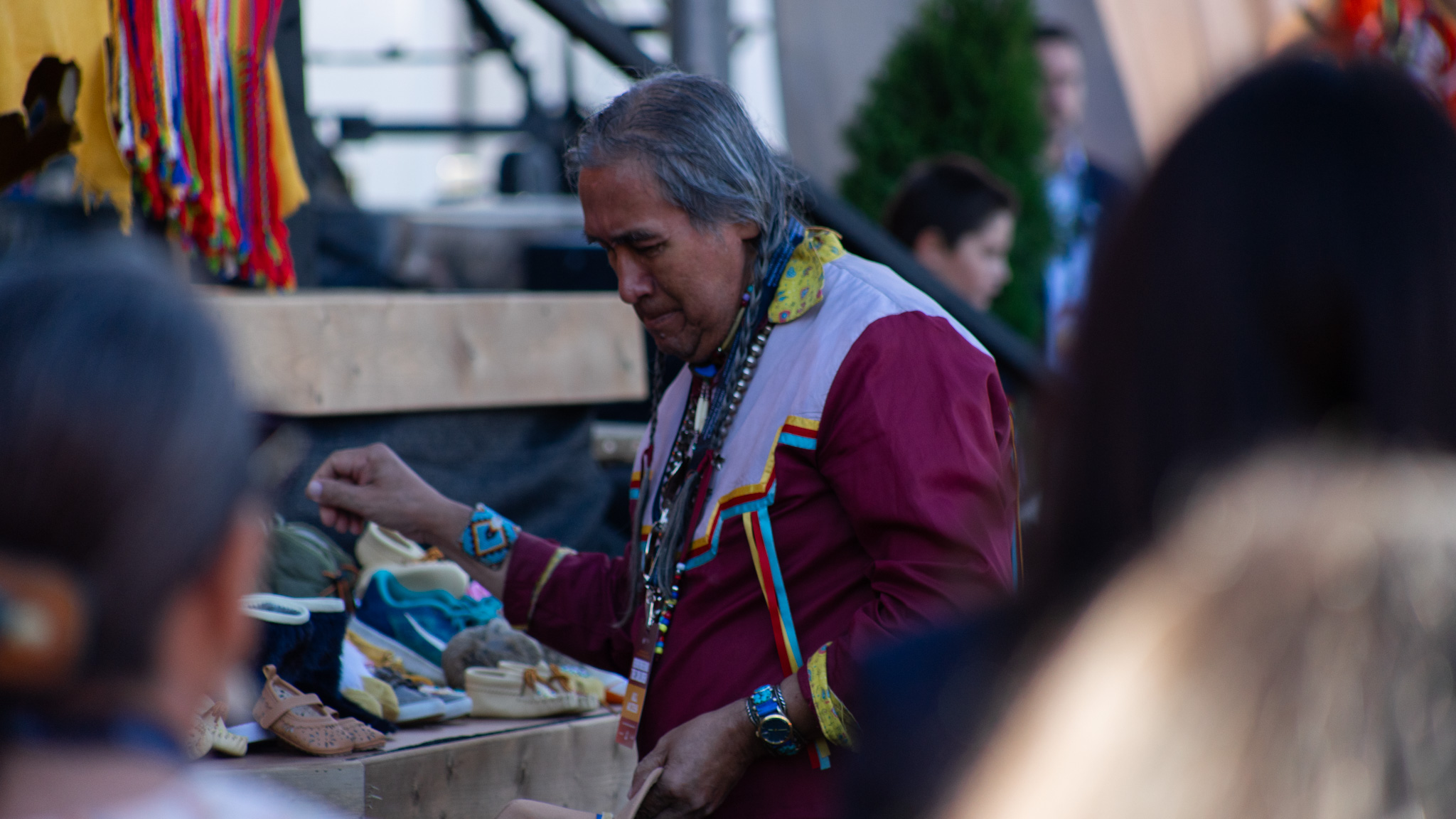 A banner with children’s names who did not return home from residential schools was unravelled during the ceremony, as children’s shoes were brought and left on a platform near centre stage.